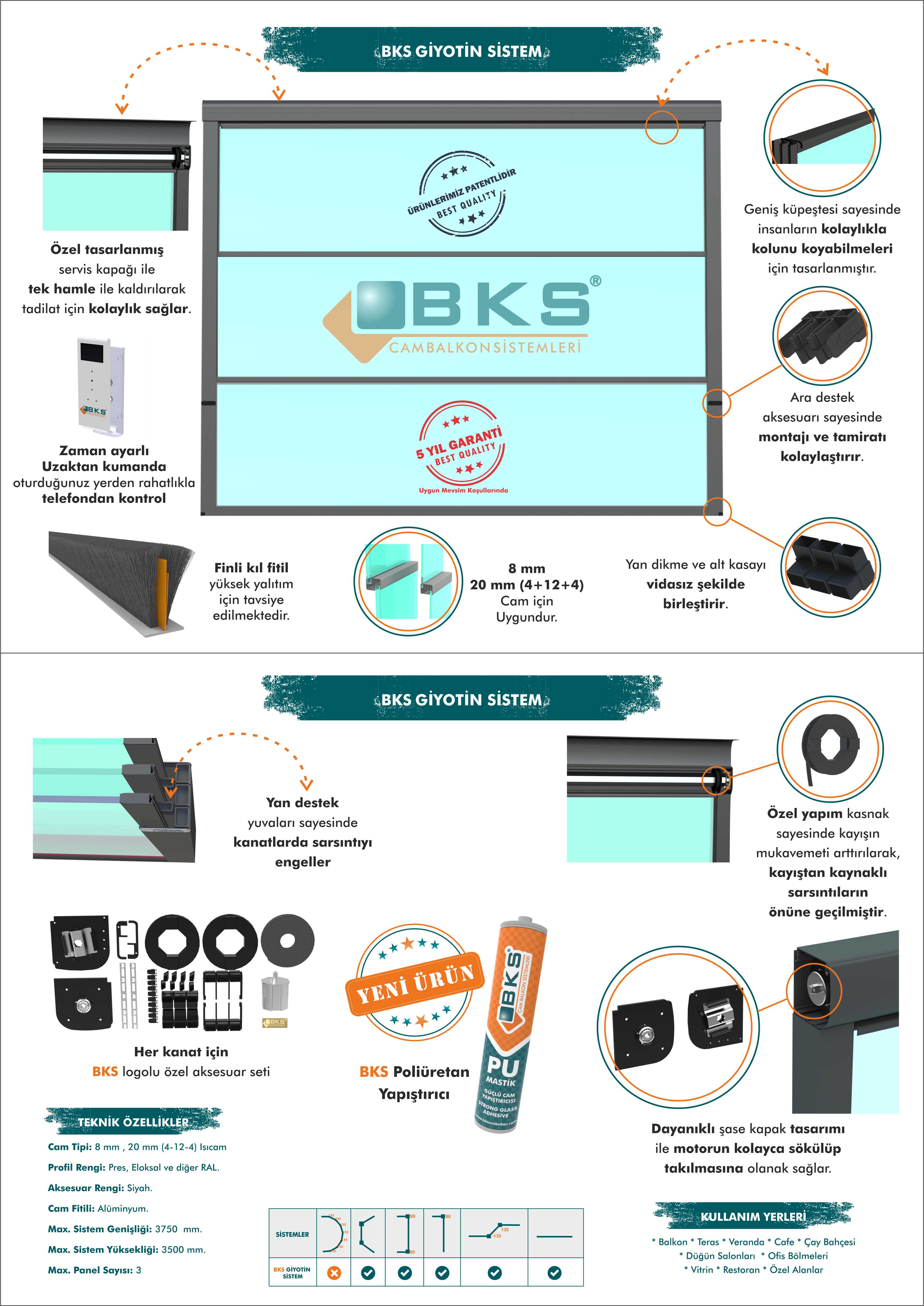 Sistem, ihtiyaca göre çift cam (4+12+4) veya tek cam seçenekleriyle sunulur. Bu sayede hem yalıtım hem de güvenlik açısından kullanıcıya esneklik sağlar. Panel set aksesuarları, montaj sürecini oldukça pratik hâle getirerek kurulumu hızlandırır. Dayanıklı yapısı ve uzun ömürlü mekanizmasıyla yoğun kullanıma uygun olan bu çözüm, yaşam alanlarında hem koruma hem de şıklığı aynı anda sunar.